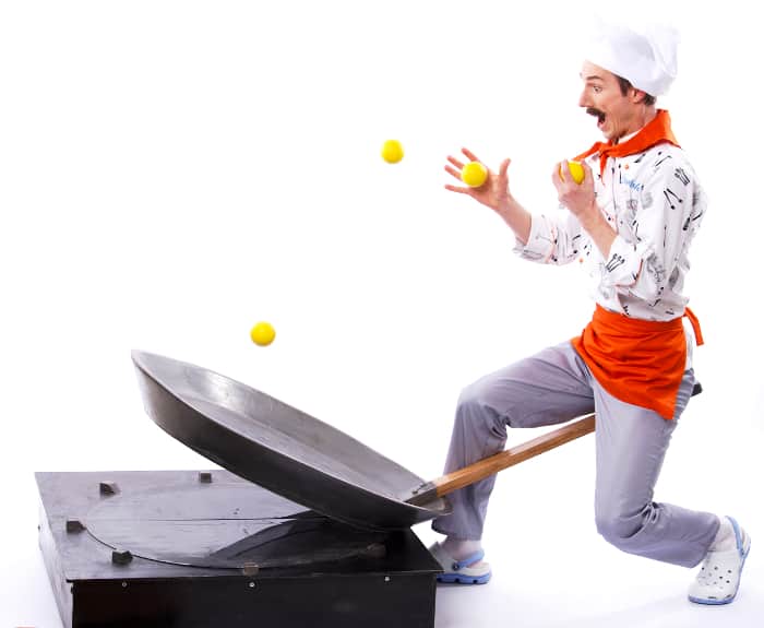 Sein neu entwickeltes Programm verbindet das beste aus beiden Welten: Hier verschmelzen Jonglage und Comedy zu einer einzigartigen Show, die dem Publikum noch lange in Erinnerung bleiben wird. Verkleidet als Koch schafft er es immer wieder, die Zuschauer zum Lachen zu bringen, ohne dabei die Konzentration zu verlieren, die man für eine Jonglage auf Weltniveau benötigt.